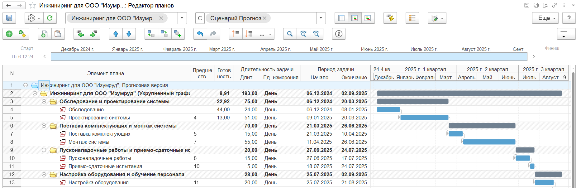 - обновленная диаграмма Ганта, синхронизированная с деревом задач;
