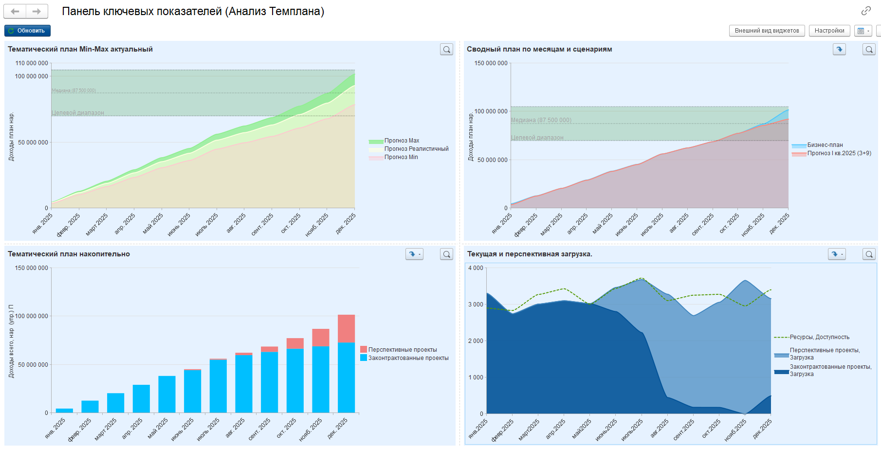 Система позволяет планировать, учитывать и анализировать KPI по доходам, расходам и маржинальности подразделений по проектам.