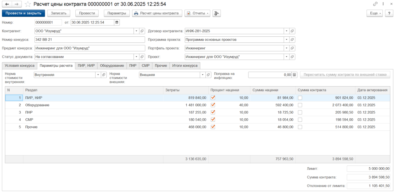 В системе предусмотрена функциональность, позволяющая на основании информации о количестве человеко-часов по ролям, необходимых для реализации контракта, и сумм прочих затрат, сформировать отчет, отражающий планируемую себестоимость контракта, возможную прибыль и рентабельность, рассчитать плановую стоимость контракта при заданном % рентабельности.