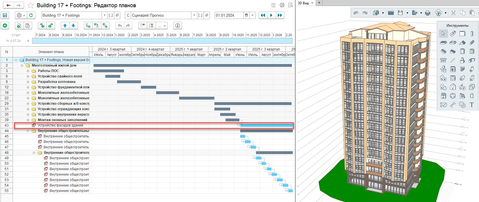 - отображение на 3D-модели (в САПР) динамики готовности объектов модели с выделением объектов, по которым ведутся работы на основании сроков выполнения и взаимосвязей строительных работ проекта