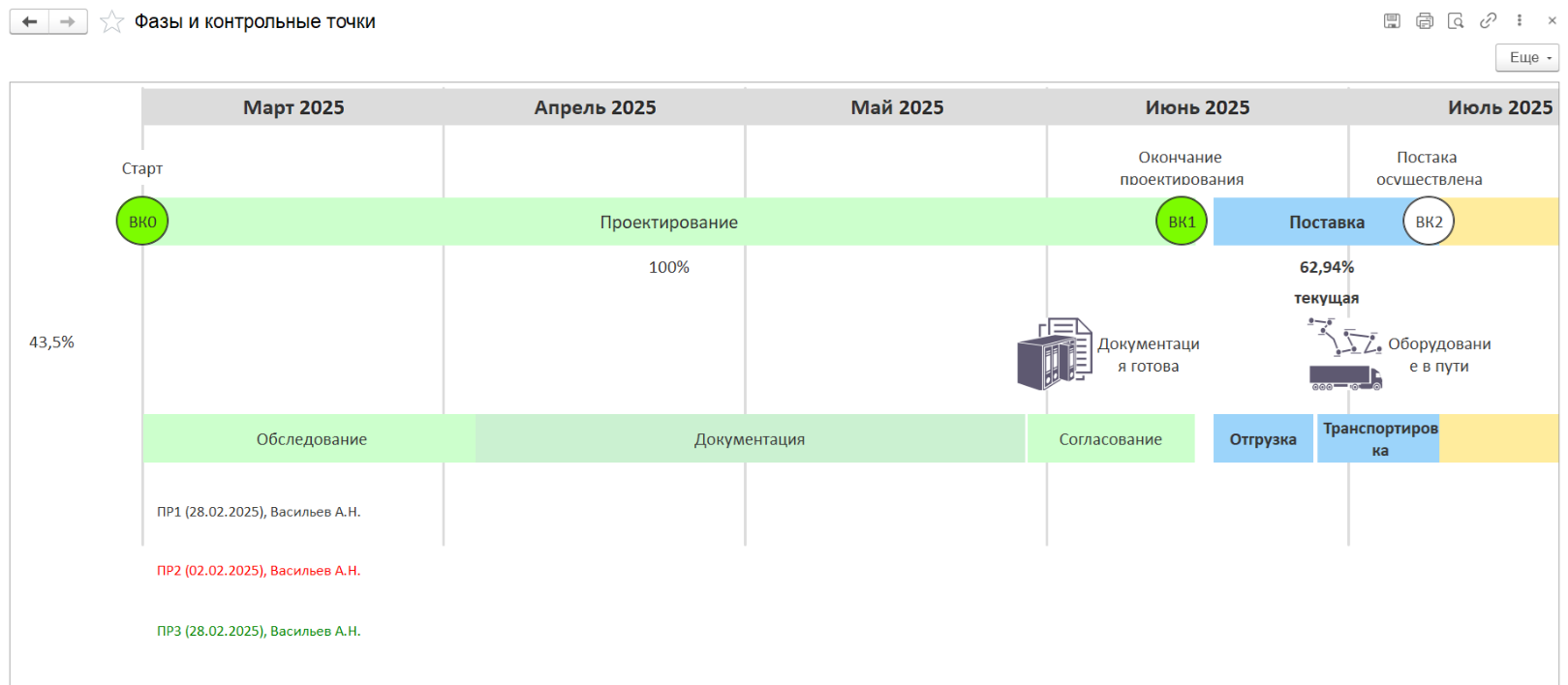 - Анализ контрольных событий портфеля проектов. Сведение информации о контрольных событиях разных проектов в одном представлении. В случае фактического или потенциально возможного срыва сроков производится расчет прогнозируемых финансовых санкций. Результаты анализа используются для принятия решений в процессе оперативного и финансового контроля деятельности предприятия;