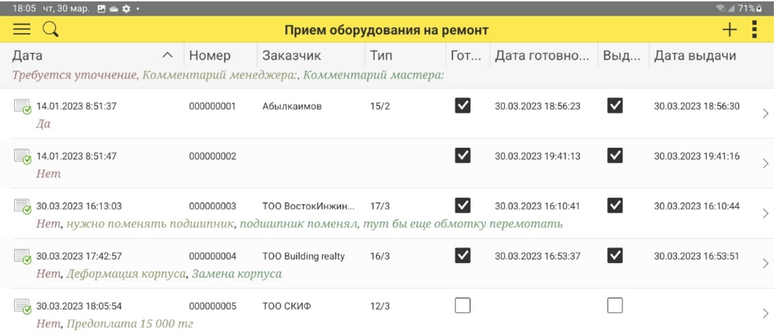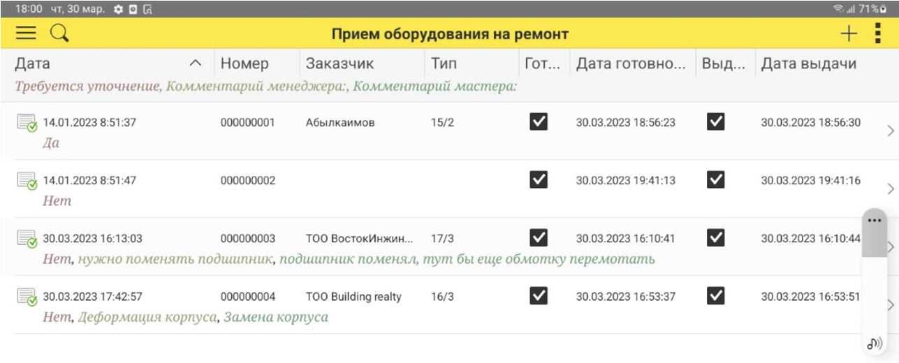 Список документов приемки заказов, в котором отображаются дата и номер заказа, заказчик, тип оборудования, состояние заказа на данный момент, а также комментарии менеджера-приемщика и мастера.