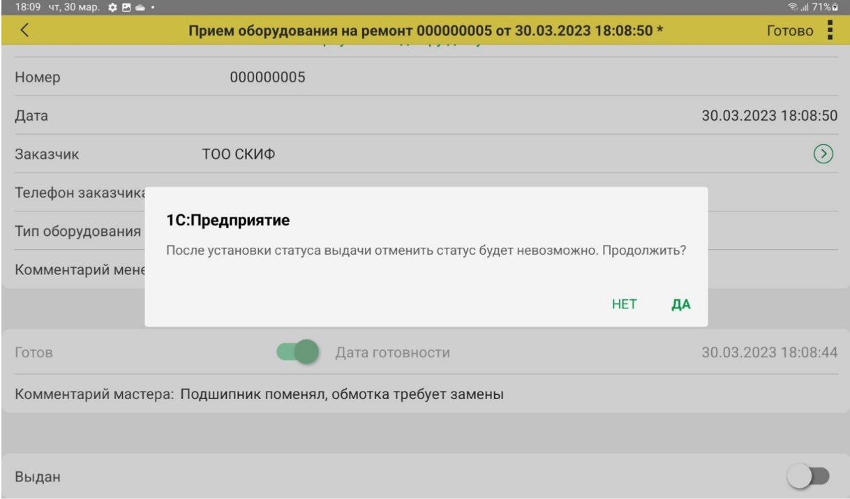 После выдачи заказа клиенту менеджер-приемщик проставляет статус «Выдан», при этом так же выводится сообщение о необратимости этого процесса.