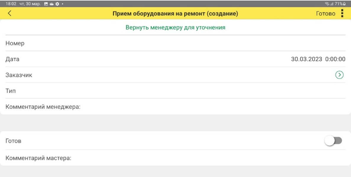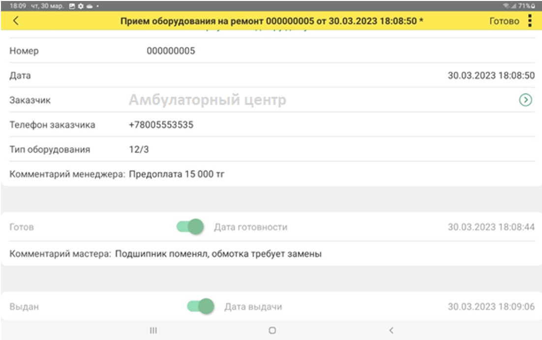 После подтверждения установки статуса готовности в форме заказа фиксируется дата и время окончания ремонтных работ.
