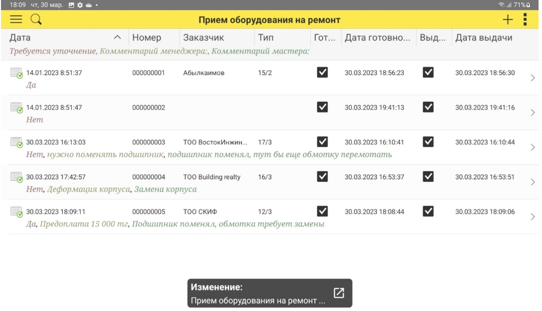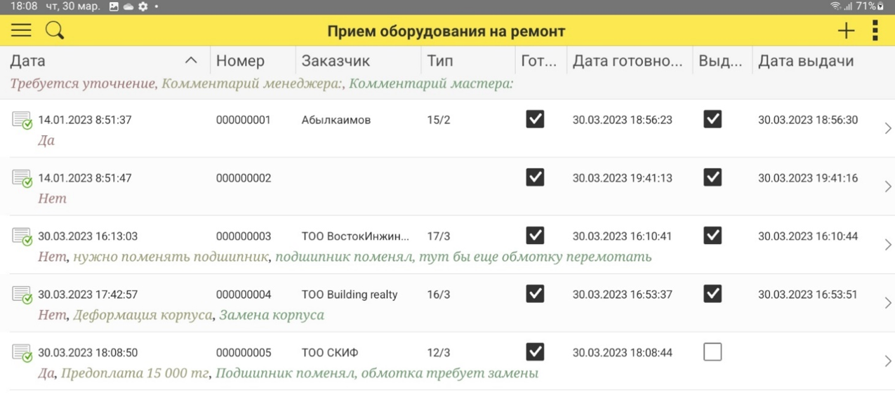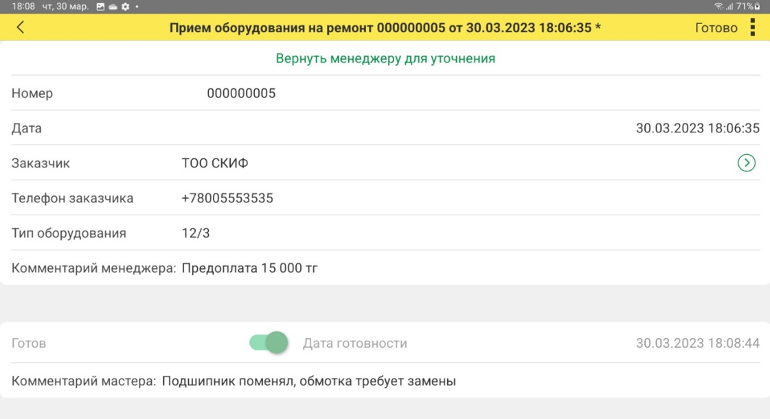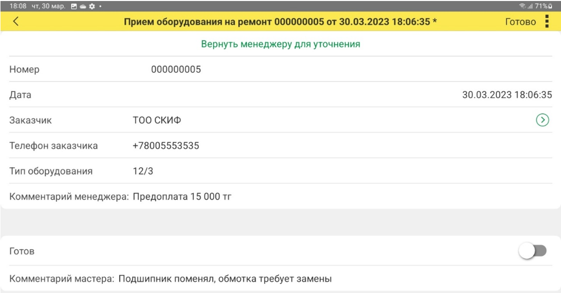 В списке заказов появляется отметка о завершении работы мастера, а заказ возвращается менеджеру-приемщику для выдачи клиенту
