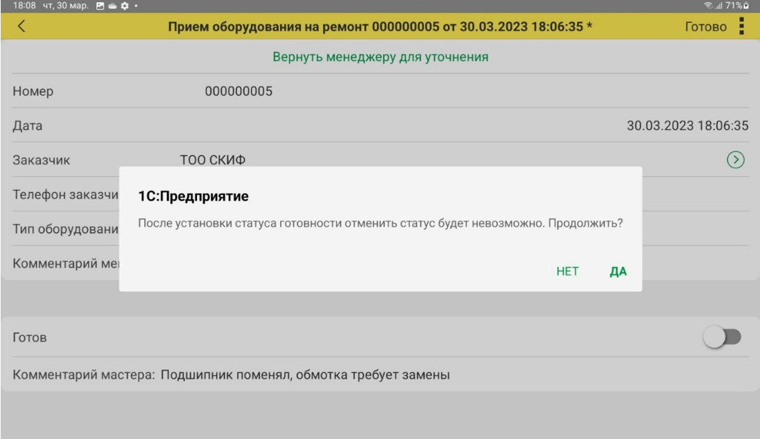 При установке мастером статуса готовности появляется уведомление о необратимости этого процесса.